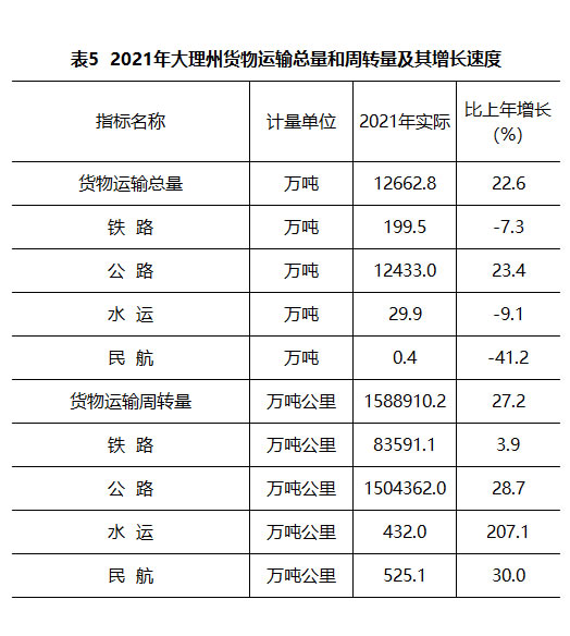 2021年,全州货物运输总量12662.8万吨,比上年增长22.6%;货物运输周转量1588910.2万吨公里,增长27.2%。旅客运输总量8579.7万人,增长3.8%;旅客周转量972143.9万人公里,增长8.0%。