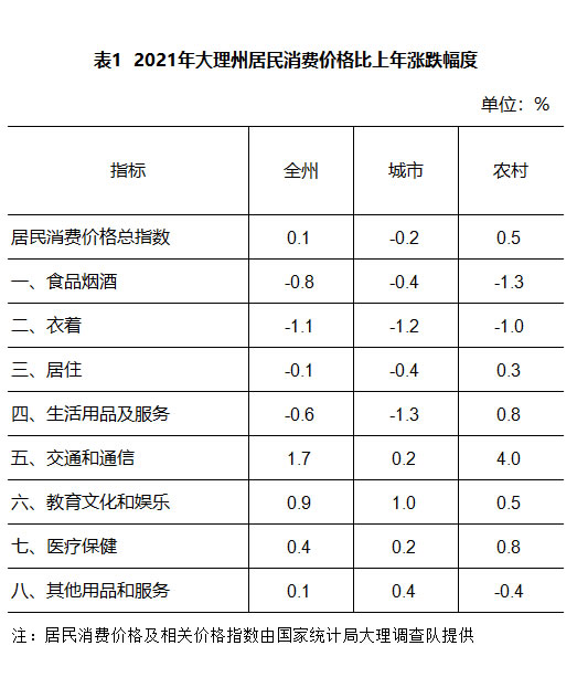 2021年,全州居民消费价格指数(CPI)为 100.1,比上年上涨0.1%。其中:食品烟酒价格下降0.8%,衣着价格下降1.1%,居住价格下降0.1%,生活用品及服务价格下降0.6%,交通和通信价格上涨1.7%,教育文化和娱乐价格上涨0.9%,医疗保健价格上涨0.4%,其他用品和服务价格上涨0.1%。