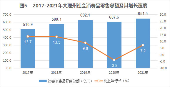 2021年,全州社会消费品零售总额651.5亿元,比上年增长7.2%。