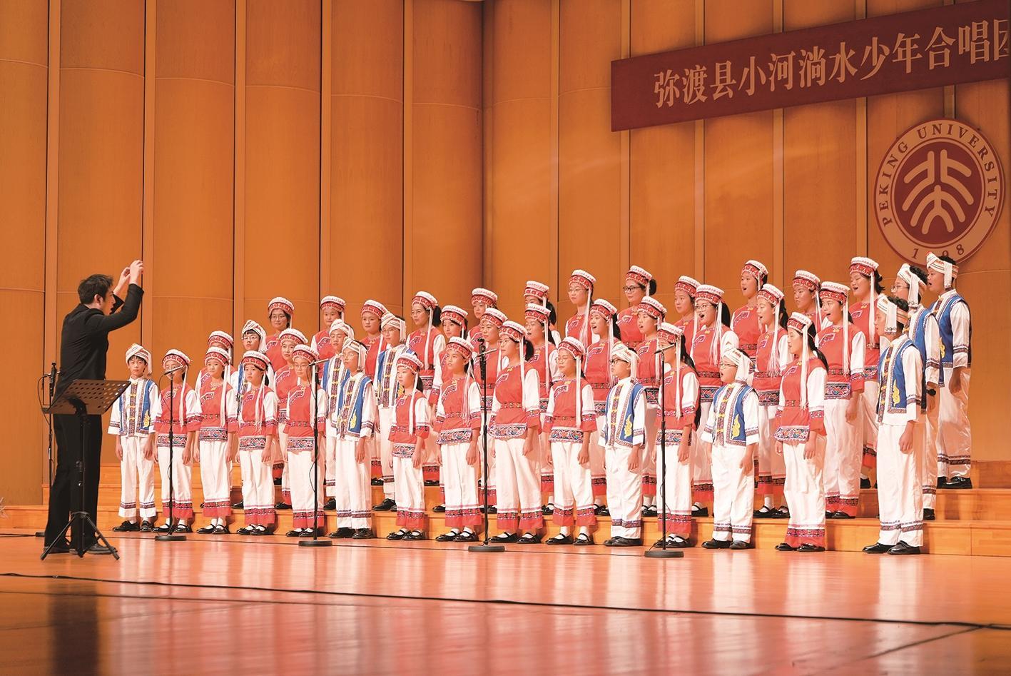 本报讯(通讯员 王玺涵 鞠强 文/图) 一曲《小河淌水》从云南弥渡的山间飘向北京大学的殿堂,10月19日晚,北京大学百周年纪念讲堂内歌声悠扬、掌声阵阵,弥渡县小河淌水少年合唱团第二次登上北大舞台,用纯净嗓音演绎民族音乐魅力。