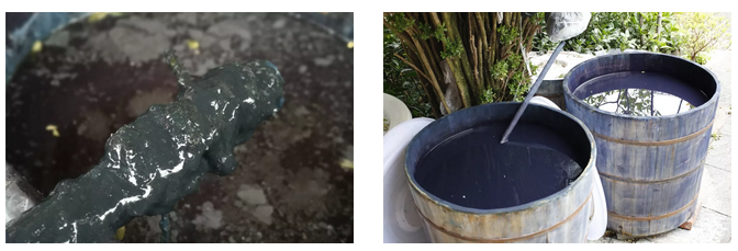 板蓝正是今天用来制药的那种板蓝根的枝叶,在周城,一年种两次,农历三月和八月,三月种下的,当年十一月即可收割,八月种下的要次年十一月才可收割。一年收割一次,连杆带叶地割下,在冷水里浸泡10多天,之后将杆和叶子捞掉,按比例加水和石灰,每天早晨拿木棍敲打100来下,直到起沫,之后发酵半年以上,等水蒸发掉,染泥就制成了,从此用水浸泡着,十多年都可以用。