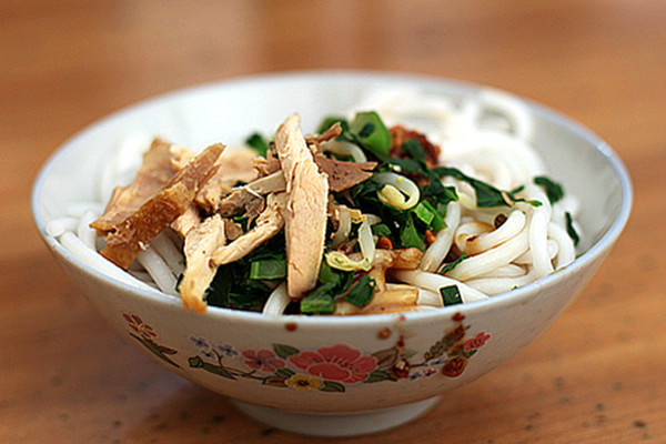 凉鸡米线是大理的一道特色小吃,它之所以人气这么旺,完全是因为它的酸甜适度的中庸口味。喜食酸辣的本地人自不用多说,口味大相径庭的外地人也能轻松接纳。米线入碗,放入各种辅料、卤鸡肉,浇上自制卤汁、油泼辣子、花椒油、熟核桃制成。让你垂涎欲滴,大理的凉鸡米线期待着和你的牙齿来一次精彩的厮杀。