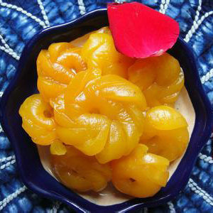 古人有诗赞雕梅:“小小青梅上指尖,巧手翻作玉菊兰;蜜糖浸渍味鲜美,疑是仙葩落人间。”雕梅因在青梅果上雕刻花纹而得名,用刻刀在经过石灰水浸泡后的青梅上雕刻,从空隙处挤出梅核,中空如缕,轻轻压启成菊花状,放入盐水中,以去梅子酸味,然后放入砂罐,再用上等红糖、蜂蜜浸渍数月,待梅饼呈金黄色时就可从瓶坛中取出食用。