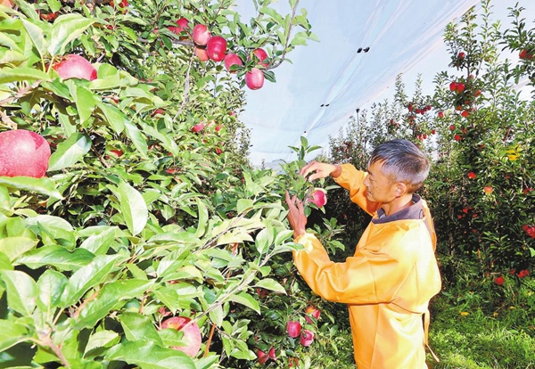 在昭阳区永丰镇苹果矮砧密植示范园里,果农在进行日常管护。