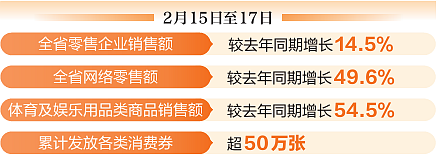 特色云品销售旺。省商务厅围绕零售、餐饮、住宿、汽车、电商等重点领域,联动各州(市)、金融机构、电商平台和重点企业,从春节假期首日起多渠道投放首批惠民消费券,覆盖线上线下消费场景,发券规模超亿元。美物消费券、美宿消费券、美食消费券、汽车专项消费券、电商消费券、海鲜专项券等多种彩云系列消费券轮番上阵,通过“政府补贴+银行助力+平台赋能+企业让利”的模式,为消费者提供“吃住行游购娱”新春消费大礼包。2月15日至17日,全省累计发放各类消费券超50万张;全省网络零售额较去年同期增长49.6%,其中鲜花、蓝莓持续热销,日均出港量分别达100万件、25万件。省商务厅重点样本企业监测数据显示,春节假期前3天,体育及娱乐用品类、粮油食品类、日用品类、饮料类、烟酒类商品销售额较去年同期分别增长54.5%、26.5%、15.9%、15%、8.7%。