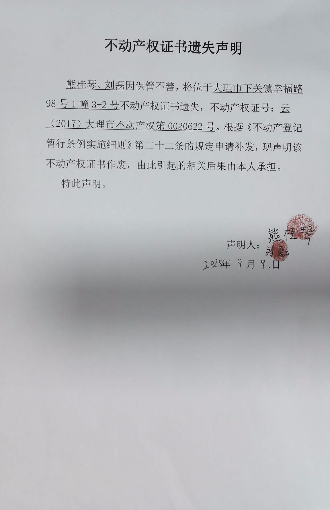 不动产权证书遗失声明