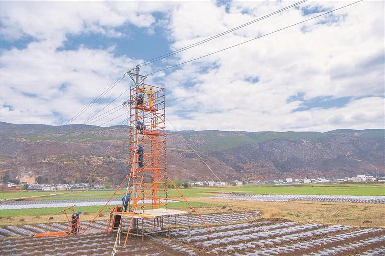 南方电网云南大理剑川供电局带电作业班免费为辖区内农业科技有限公司搭接线路引流。(摄于3月22日) 据了解,剑川县高原特色粮蔬协同种植示范项目,建设大棚近800亩,项目投产后预计年产有机粮蔬近5000吨。当了解到项目对电力的需求后,剑川供电局为企业用户开辟“绿色通道”,确保企业“落地即通电、投产即满产”,为高原特色粮蔬示范项目送上“及时电”。 [通讯员 王和星 摄]