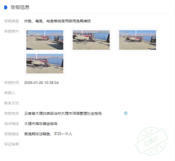 2026年1月26日,有群众通过“洱海卫士”小程序反映:在云南省大理白族自治州大理市海东镇金梭岛附近的洱海湖区范围内,存在违规锚鱼现象。