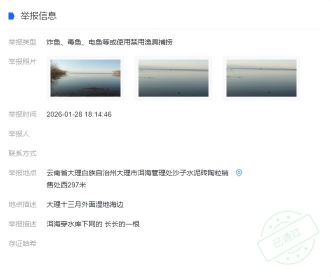 2026年1月28日,有群众通过“洱海卫士”小程序反映:在云南省大理白族自治州大理市洱海管理处机场路附近湿地海边附近的洱海湖区范围内存在使用禁用渔具捕捞行为。
