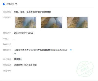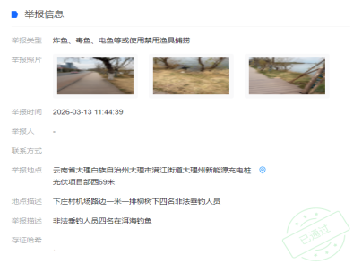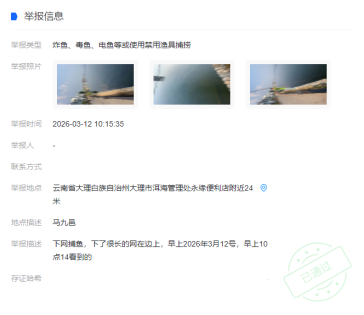 2026年3月12日,有群众通过“洱海卫士”小程序举报称:在大理银桥镇马久邑村永缘便利店附近,存在非法下网捕鱼的情况。