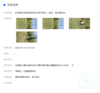 守护洱海,你我同行:自2026年1月1日“随手拍举报”机制推行以来,该机制已融入居民日常,成为守护洱海的一股坚实力量。如果您发现身边有类似破坏洱海生态环境的行为,请积极通过“洱海卫士”小程序进行一键举报。洱海的清澈,离不开每一双敏锐的眼睛,也离不开每一次及时的行动。让我们继续携手,切实参与到守护这片碧水的行动中。
