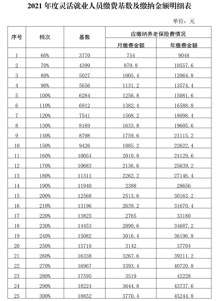 2021年,个体灵活就业人员共有25个缴费档次供参保人员自主选择。各缴费档次见下表。缴费基数一经缴费人员确定,本年度内不得变更。