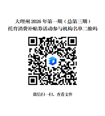 全州在2025年12月31日前完成备案,并于2026年1月25日前经各县市认定为普惠的托育机构,可扫“大理州2026年第一期(总第三期)托育消费补贴券活动参与机构名单二维码”,获取托育机构名单。