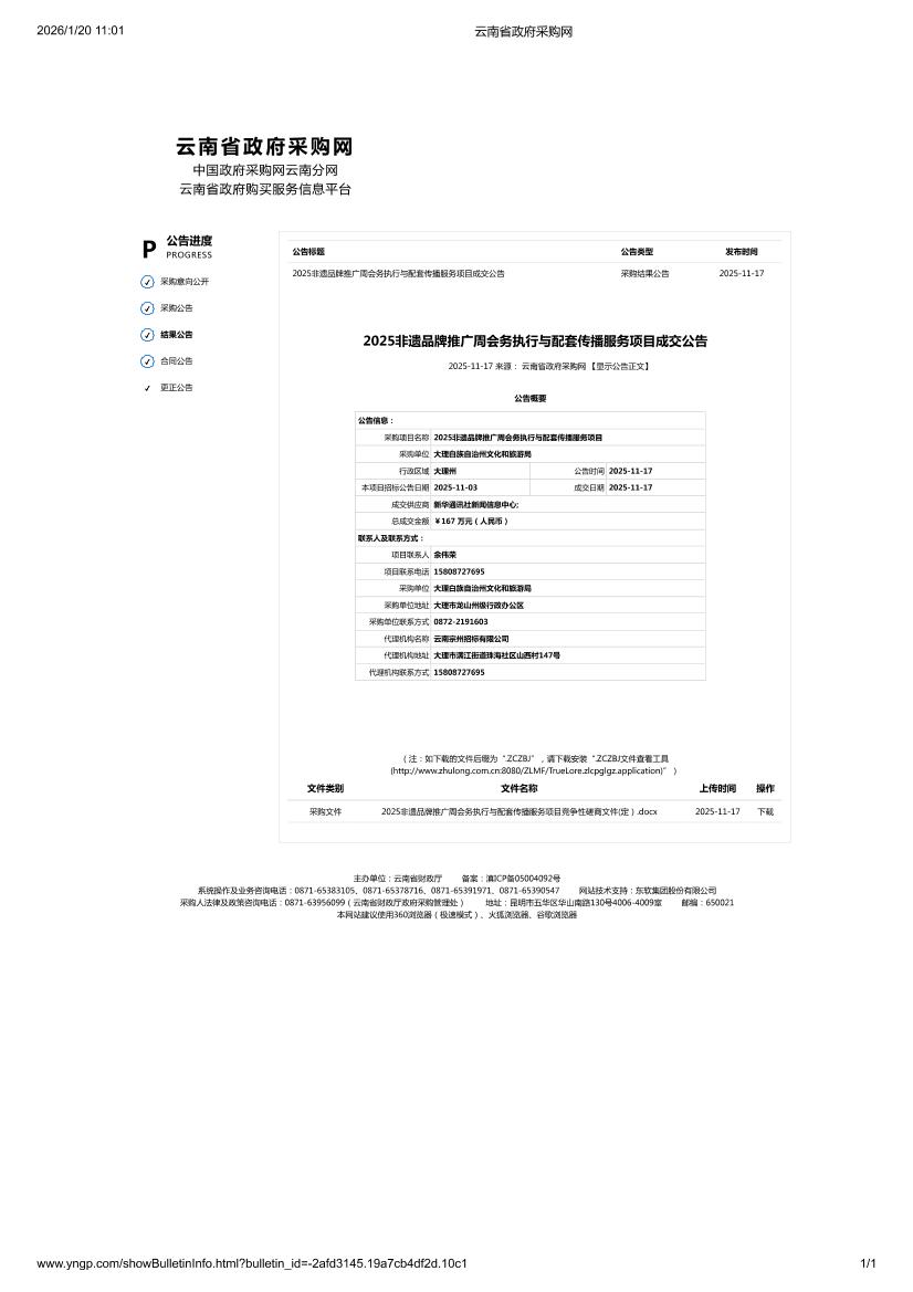 大理白族自治州文化和旅游局关于2025非遗品牌推广周会务执行与配套传播服务项目成交公告