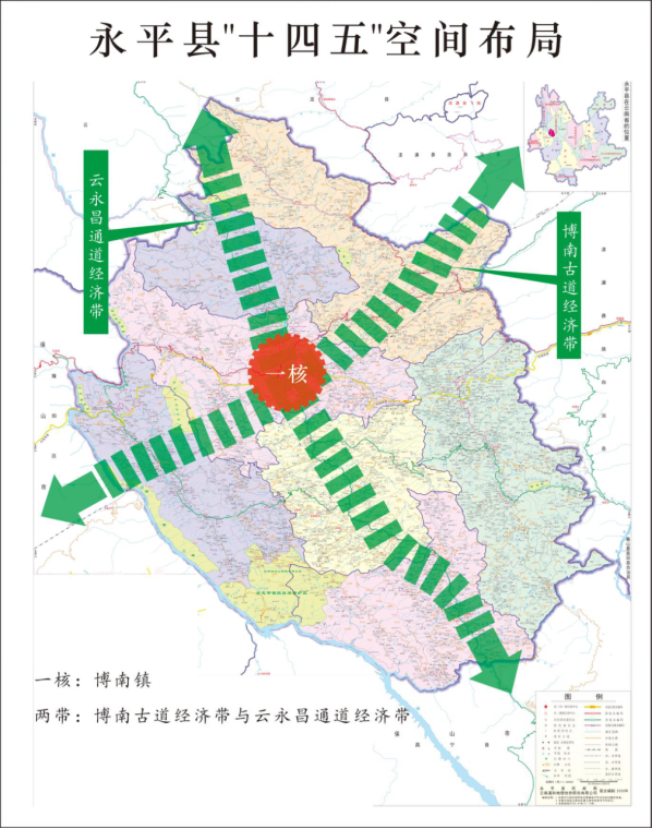 立足全县通道区位,打造博南古道经济带与云永昌通道经济带,实现两带融通,联动全县经济社会发展。